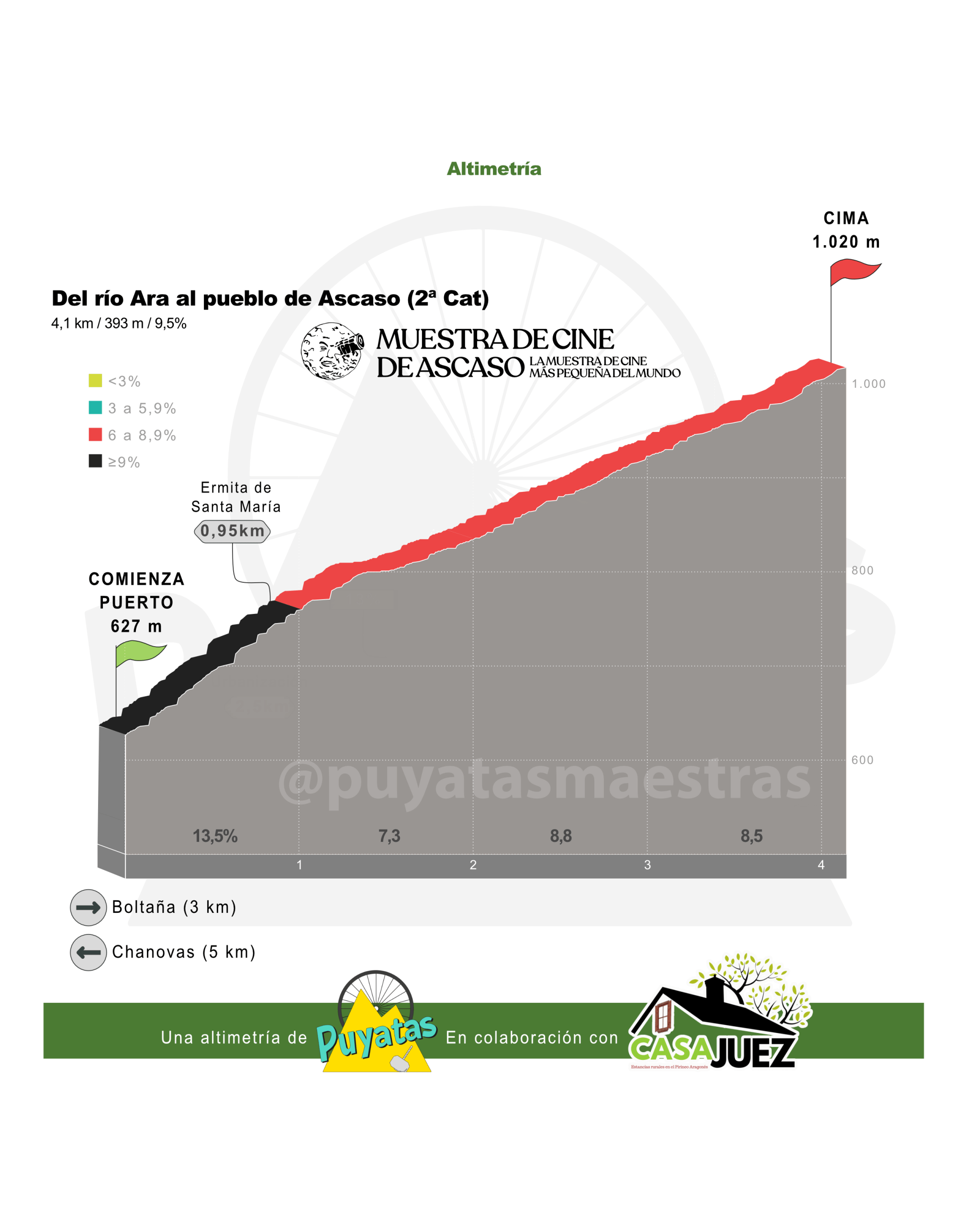 Subida a la mítica localidad de Ascaso (“Ascaso presidiendo el consejo de Aragón…”, que cantan los Au d’astí). Donde el barranco del mismo nombre que el pueblo desemboca en el río Ara, empieza el puerto. Poco más de 4 kilómetros disfrutones, picantes y con cancaneo (me van a pitar los oídos en el primero de ellos). 100% asfalto en bastante buen estado, apto para cualquier tipo de bicicleta, y cualquier tipo de ciclista, que aquí cabemos todos.