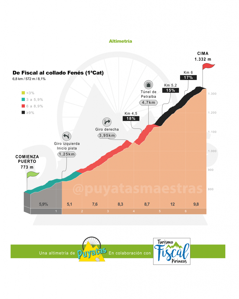Estás en Fiscal, a orillas del Ara. En la margen derecha del río, donde comienza la antigua carretera que subía a Lardiés, comienza también el puerto. Subida al mítico collado Fenés, pasando por encima de la entrada del túnel de Petralba. Mucho cambió el paisaje de esta zona desde su inauguración en julio de 2012, pero sobre todo facilitó las conexiones por carretera con este maravilloso rincón del Pirineo aragonés.