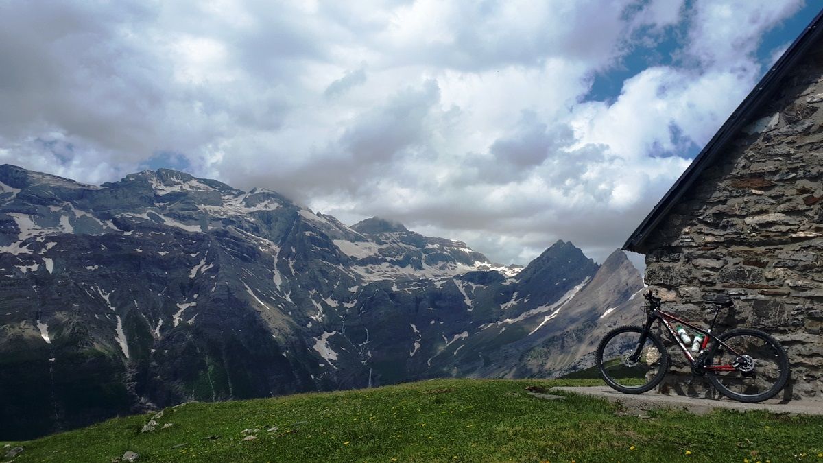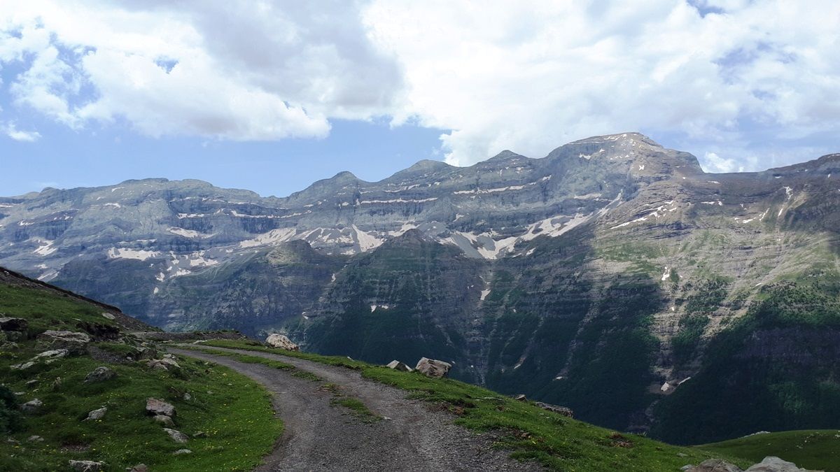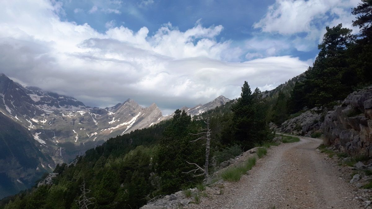 Nada más pasar el pueblo, comienza la pista de ‘La Estiva’ y empiezas a pisar tierra. Pista en perfecto estado que básicamente remonta el valle de Pineta por su pared derecha. ¡Vaya espectáculo! Valle de origen glaciar, brutal, muy escarpado y sobre todo bonito de cojones. Situado al este del macizo de Monte Perdido, su cabecera está dentro del Parque Nacional de Ordesa y Monte Perdido.