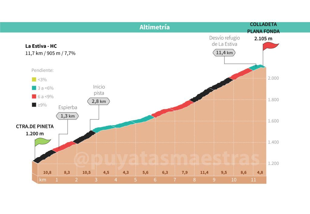 La pendiente en este punto va de menos a más, llegando a ser bastante alta en los últimos kilómetros, antes de llegar al refugio de ‘La Estiva’. Pedaleas casi todo el rato a cielo abierto, aunque vas a encontrar bosque en casi toda la ascensión.