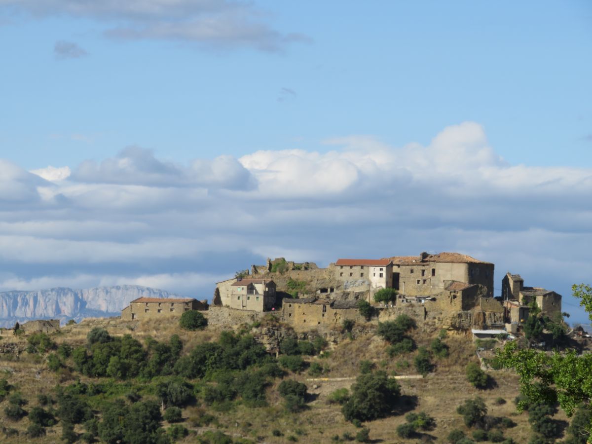 Un primer tramo de nueve kilómetros y medio de ascensión por encima del 5% de media, te lleva al paso del pueblo de Castellnou de Montsec, que parece estar enclavado en mitad de la nada. El sitio es precioso, eso sí, pero casca el sol de narices, aún estando por encima de los mil metros de altitud. Recuerdo sufrirlo en el mes de septiembre, con la boca seca y sudando como un pollo (no le llego a ver el sentido a esta expresión, pero la uso bastante). Subir a las tres de la tarde, con la comida en la garganta, igual no ayudó mucho tampoco. ‘Haber estudiao’. En esto de la bici, se queman neuronas al mismo ritmo que calorías, que le vamos a hacer.