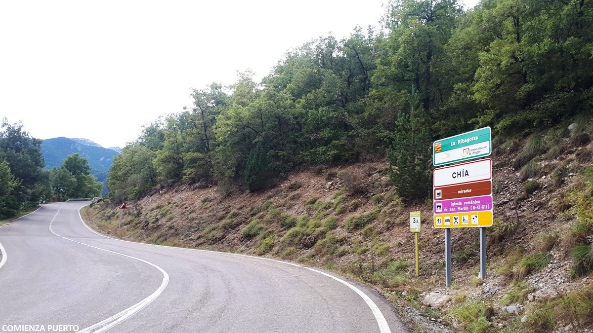 Estás en Castejón de Sos, en pleno valle de Benasque. Cruzando el río Ésera sale la carretera que te sube hasta el pueblo de Chía. El comienzo de esa carretera es también el comienzo del puerto.