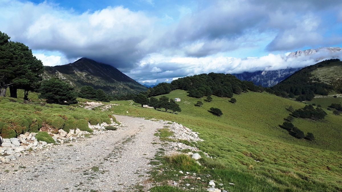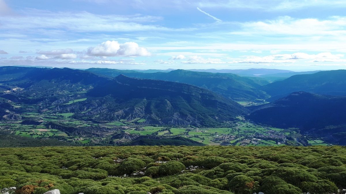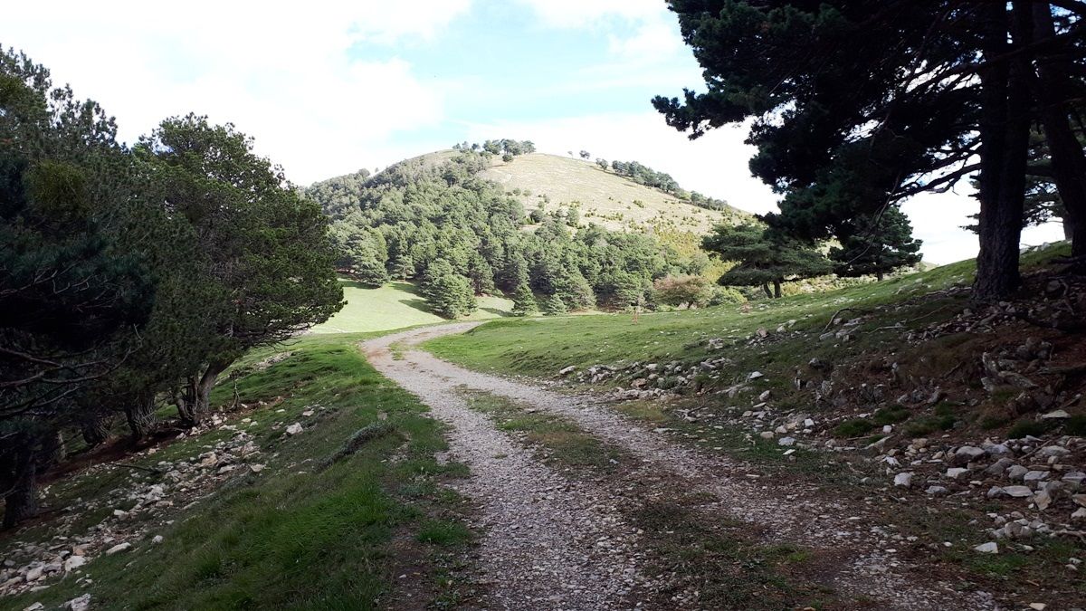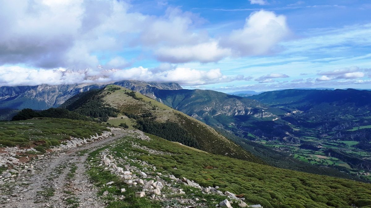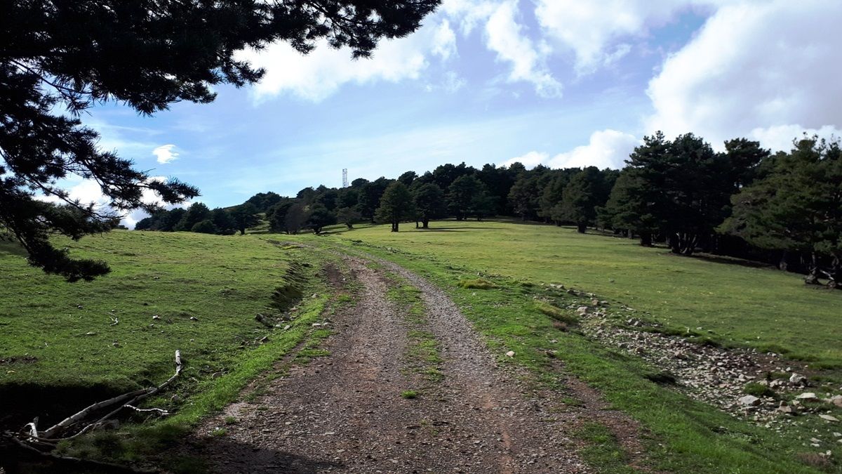 Una vez en lo alto de la sierra, te viene un descansillo que ciertamente vas a agradecer. El entorno cambia totalmente, se abre y aparece una alfombra verde de hierba que, tirando de memoria, recuerdo que llegué a pensar que estaba repasada a cortacésped. Allí en medio de ninguna parte y por encima de los 1.500 metros de altitud.