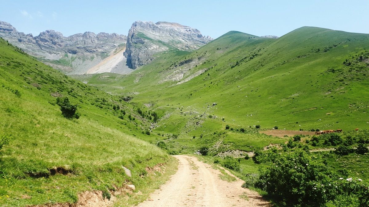 En el último tramo de la ascensión, el mapa dibuja unas curvas de herradura, pasando por el refugio de las Planas de Abozo, hasta llegar al refugio de la Faja que es la cima del puerto. Estás justo a los pies del tozal de Suaso, en lo que podrían ser las faldas de la sierra Tendeñera, que la tienes de fondo.