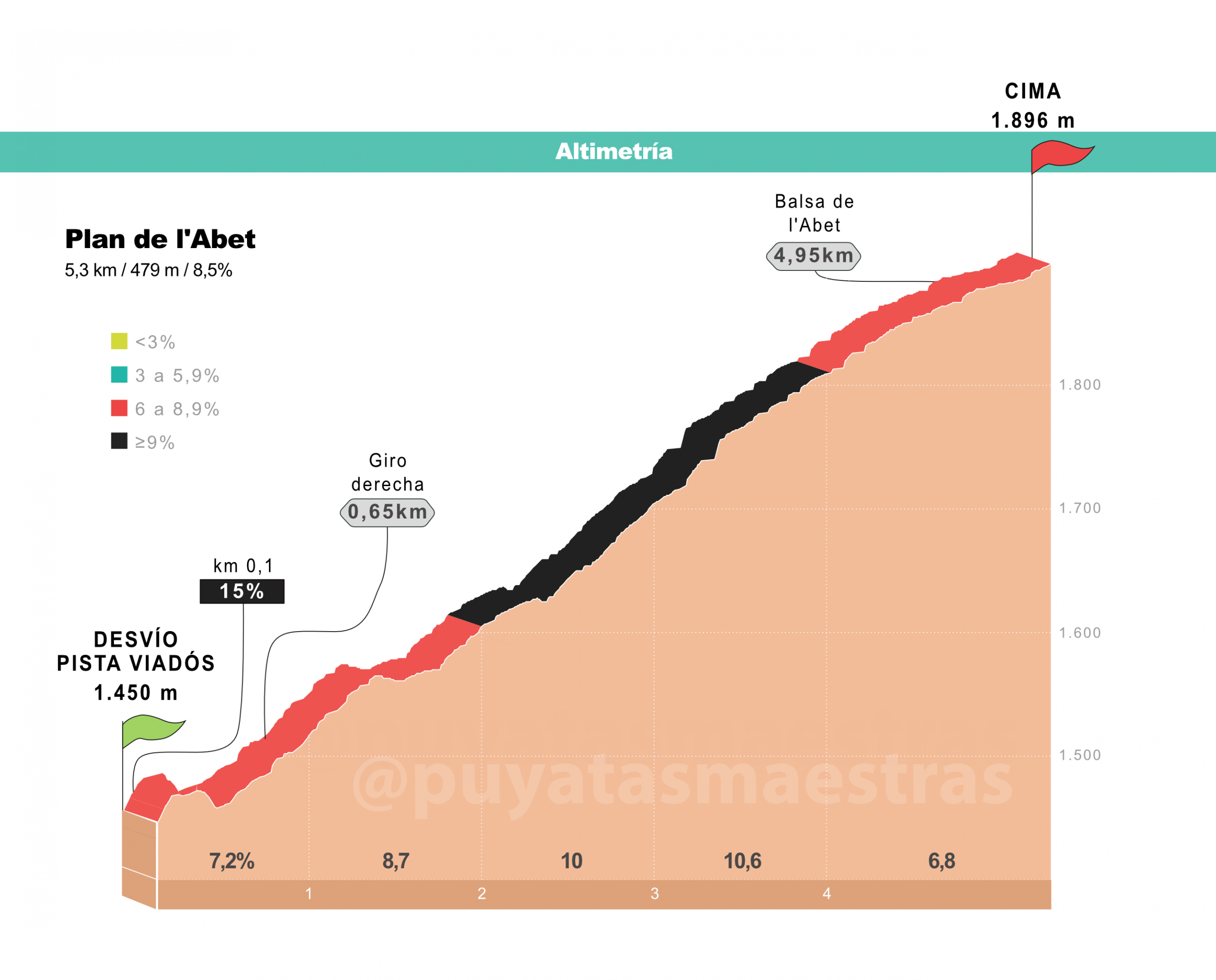 Y para que veas lo bien que hilo las cosas, esta altimetría viene con regalo. Concretamente regalos en forma de tres altimetrías más. Las subidas a la borda del Monzarro, la balsa de L’Abet y la zona de Sarrau pasando por el refugio de Tabernés (todas ellas desvíos de la pista principal a Viadós). Tenemos entonces, un puerto con tentáculos, el ‘Doctor Octopus’ de las puyatas. Cuatro altimetrías en una, para que puedas dibujar tus rutas por este rincón del Pirineo aragonés. Ya te da para seguir explorando eee. Si quieres alguna idea más, la Cruz de Guardia, el ibón de Plan, puerto de Sahún, etc.