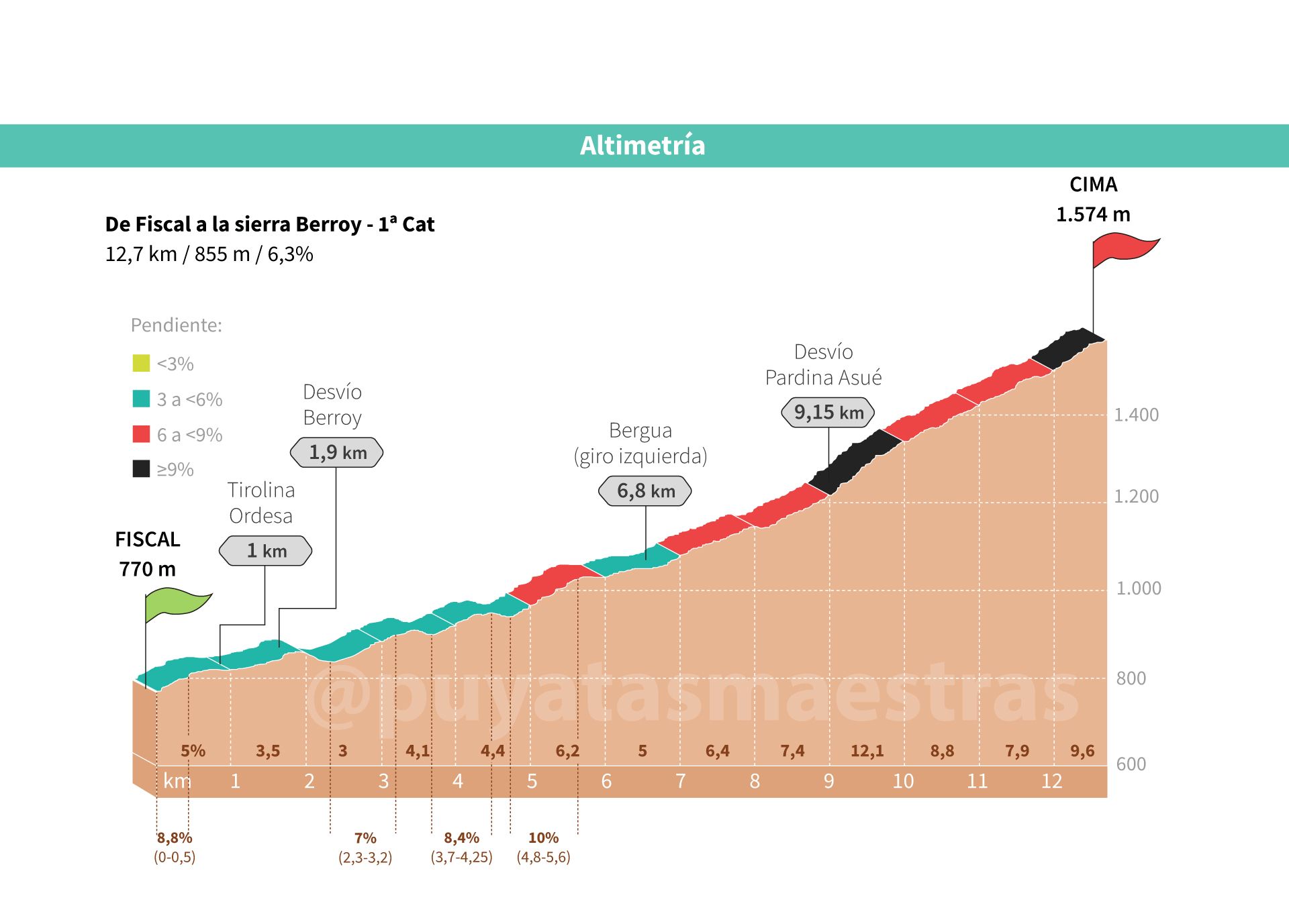 Estás en Fiscal, municipio de la comarca oscense del Sobrarbe. En la rotonda donde empieza la carretera que sube a Bergua comienza el puerto. Subida híbrida asfalto-tierra, con bastantes atractivos deportivo/culturales y una parte final que probablemente te sorprenda.